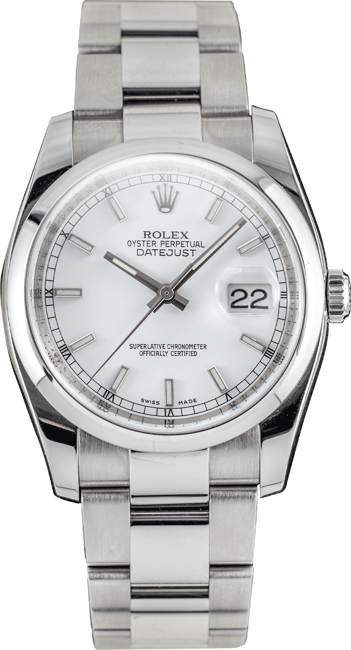 The Rolex Datejust 36 Ref. 116200 captures timeless design through a minimalist execution of the classic Datejust aesthetic. Its 36 mm Oyster case in stainless steel is paired with a smooth domed bezel and an Oyster bracelet, delivering a clean and versatile profile. The white baton dial features applied hour markers and polished hands for crisp legibility beneath the sapphire crystal with Cyclops magnifier. This piece also features the Roulette date wheel, alternating date colors between red and black. Powered by the Rolex Calibre 3135 automatic movement, this watch combines precision, durability, and refined style suitable for any occasion.