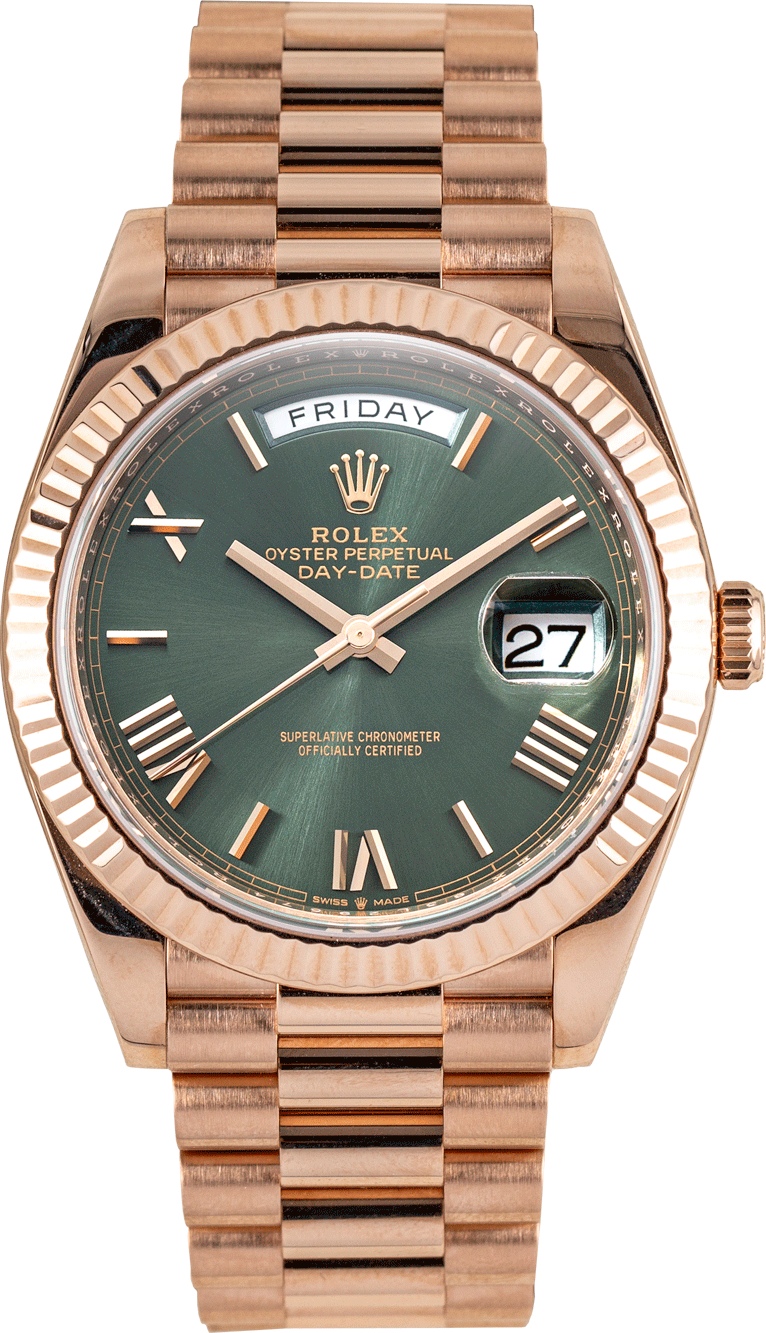 The Rolex Day-Date 40 Ref. 228235 is crafted from solid 18k Everose gold and features a 40 mm Oyster case with a fluted bezel. Its olive green sunray dial is fitted with gold Roman numerals and displays the day of the week at 12 o’clock and the date at 3 o’clock through a Cyclops lens. Powered by the Rolex Calibre 3255, this model offers a 70-hour power reserve, anti-magnetic performance, and precise timekeeping. The case is paired with a matching Everose gold President bracelet that features semi-circular links and a concealed folding Crownclasp for a seamless look. With a thickness of 12.2 mm and lug-to-lug length around 47.3 mm, it wears with balanced presence on the wrist.