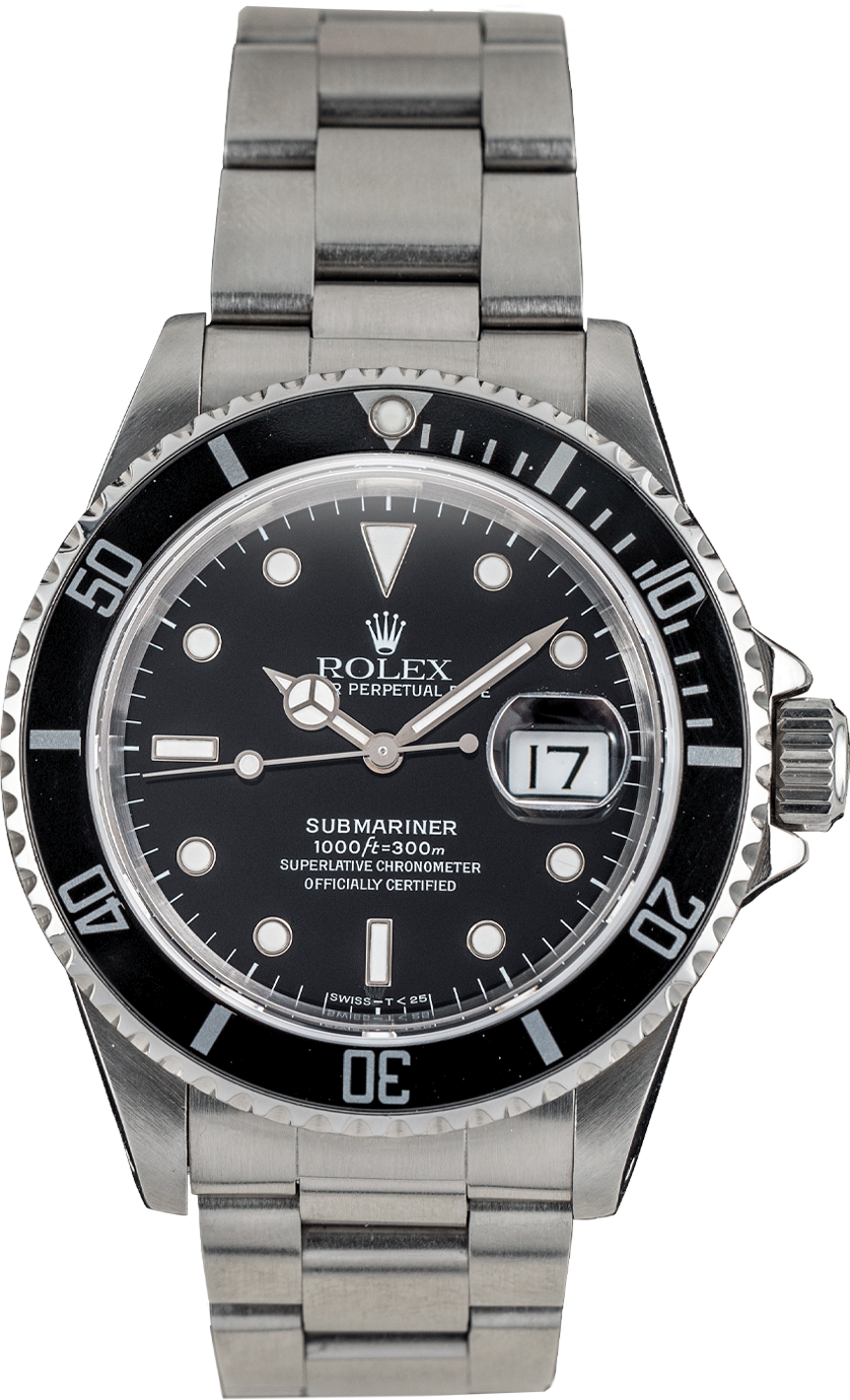 The Rolex Submariner Date Ref. M16610 is a late-production variant of the classic stainless steel Submariner. The 40 mm Oyster case features a black aluminum bezel insert and matching black dial with luminous hour markers and Mercedes hands, providing the model’s familiar dive-ready legibility. Powered by the automatic Calibre 3135, it offers dependable accuracy and a quickset date beneath a sapphire crystal with Cyclops magnifier. This example retains its original hollow-link Oyster bracelet and embodies the robust character of pre-Ceramic Submariners.
