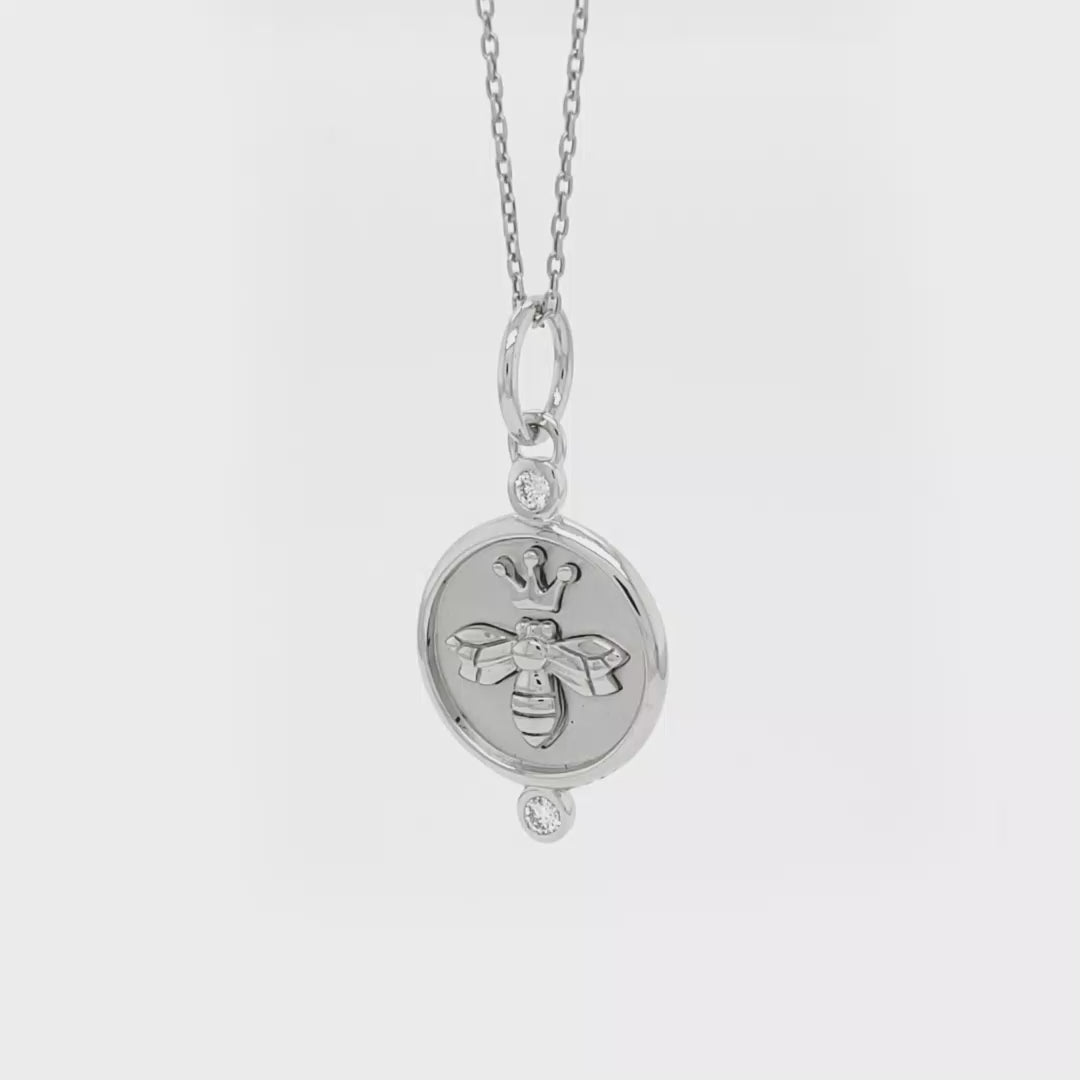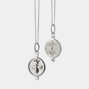 The Monica Rich Kosann Queen Bee Pendant in sterling silver features a crowned bee motif, symbolizing strength and leadership. Accented with round white sapphires totaling 0.06 carats, this pendant is finished with intricate sunburst detailing on the reverse. Suspended from an 18-inch sterling silver chain, it’s a modern talisman of confidence and grace.
